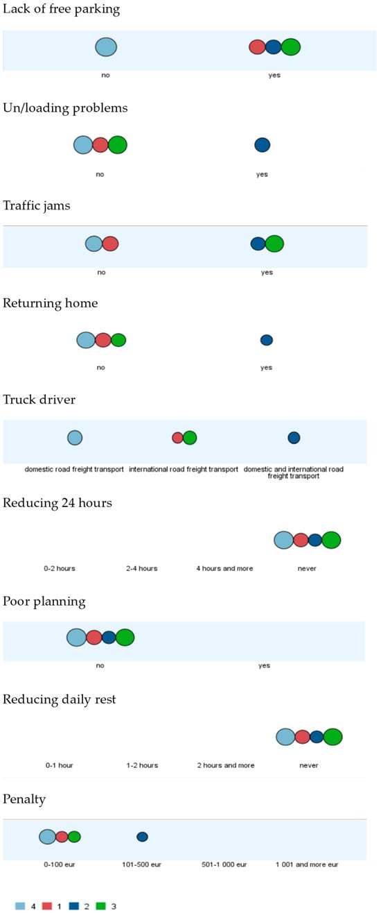 The results show that the second (dark blue) cluster mainly includes drivers of both types of transport, domestic and foreign truck transport; these drivers most often paid fines of EUR 101 to EUR 500, unlike the other groups. Moreover, this group mostly experiences loading or unloading problems, as more than 80% of the 99 truck drivers were included in this cluster. These drivers violate the social legislation due to traffic accidents and congestion, together with the first (red) cluster, because almost 80% of the drivers out of 237 are included in one of these two groups. The first (red) cluster consists mainly of drivers engaged in international road transport; this group does not experience problems with loading or unloading, similar to the third (green) cluster. Truck drivers from the third (green) cluster do not violate the social legislation at all, even due to traffic accidents and congestion, poor planning or driving home. On the other hand, this group experiences problems with parking; almost one third of all drivers who experience problems with parking are included in this cluster. Finally, the two-step cluster analysis shows that the first (red) cluster violates the social legislation primarily due to traffic accidents and congestion, but also a lack of parking spaces, unlike the other groups, because almost half of the drivers with this problem are included in this cluster. The first (red) cluster consists mainly of drivers engaged in international road transport, but drivers involved in domestic and international road transport are also significantly represented. These results can help to identify problem groups of drivers in order to design educational courses to eliminate violations of traffic regulations, especially in foreign road transport, and to improve traffic planning.