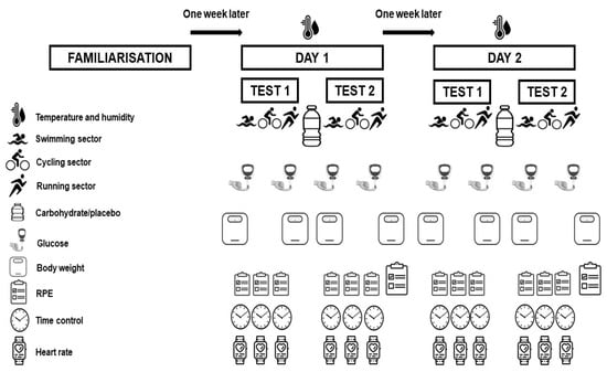 Body weight and baseline blood glucose were measured before and after each trial. During the test, heart rate and speed were monitored in each sector, and the subjective perception of effort (RPE) was evaluated (Figure 1).