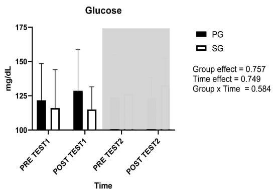 The following are the results obtained during the investigation. Figure 3 represents the glucose concentrations before and after the tests. No significant differences were observed. However, after supplementation (grey shading), an increase in the SG was observed.