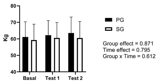 Evolution of the participants’ weights throughout the study. PG: placebo group; SG: supplemented group. Basal: basal measurement.