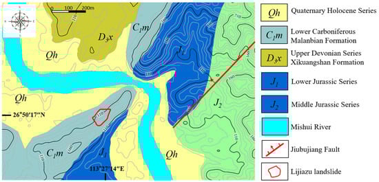 The Lijiazu Landslide is in Shijiang Village, Huju Town, Chaling County, Zhuzhou City, Hunan Province, China. The main landslide is on the east bank of the Mishui River, about 200 m from the river. Geologically, it is on the southwestern edge of the Chayong Basin, with the main fault being the Jiubujiang Fault, which runs NE–SW (Figure 1). In the study area, there is no significant recent tectonic activity, indicating that it belongs to a relatively stable tectonic block. According to the local geological map (Figure 1), the main exposed geological formations in the study area consist of the Devonian, Carboniferous, Jurassic, and Quaternary periods. The exposed geological formation of the landslide area is characterized by the Carboniferous Malanbian Formation.