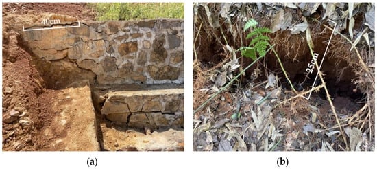 Landslide deformation signs: (a) cracks in the retaining wall at the front edge of the landslide; (b) landslide trailing edge crack.