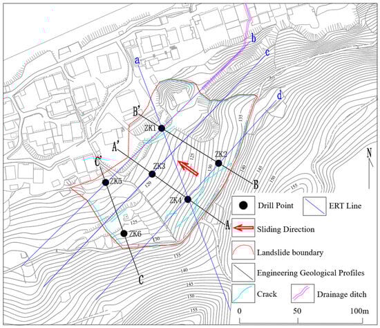 This study involved a comprehensive collection of geological data including regional tectonic background and lithology of the study area. Electrical resistivity tomography (ERT) was employed in the study area to obtain multiple ERT profiles through data inversion. By combining geological information from boreholes and other sources, the morphological characteristics and depth of the sliding surface could be determined. The following conclusions were drawn: