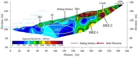 Figure 7 presents the inversion result of the landslide along three survey lines, namely “h”, “i”, and “j”. By examining the resistivity profiles of four survey lines, it can be observed that the geological information reflected at these common points is consistent. From the resistivity profile, it is evident that the surface resistivity of lines “h”, “i”, and “j” gradually increases. This also corresponds to the actual situation where the content of gravel in the superficial clay layer increases continuously from the base to the top of the slope (HRZ-1 in Figure 7). At the same time, several resistivity anomalies can be observed in these three profiles: (1) In the 0–70 m section of profile “h”, the resistivity of the entire rock formation is less than 150 Ω·m. This is due to the fact that this section of the profile is located in a drainage ditch in a residential area, resulting in a low resistivity state caused by the infiltration of surface water. (2) High resistivity anomalies can be found at the boundaries of the landslides in profiles “h”, “i”, and “j”. This is because the landslide boundaries are characterized by cracks, which lead to high resistivity anomalies (HRZ-2 in Figure 7). (3) Below the sliding surface in all three profiles, there are large low resistivity bodies with resistivity less than 300 Ω·m (LRZ in Figure 7). This is attributed to the underlying bedrock of high water-content limestone formation, which exhibits a low resistivity anomaly due to the influence of water.