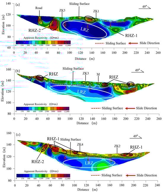 ERT profile of line “h” (a), line “i” (b), line “j” (c). LRZ: low-resistivity zone; HRZ: high-resistivity zone.