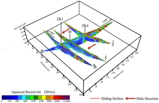 This paper presents inversion result of four survey lines obtained through grid layout testing. Based on their relative positional relationships, these four profiles are then utilized to construct three-dimensional conceptual diagrams from different perspectives (Figure 8). Figure 8 demonstrates vividly the morphological characteristics of the sliding surface and the sliding direction of the slope. The “h”, “i”, and “j” survey lines that intersect with a survey line at points ZK1 (drill hole #1), M, and ZK4 (drill hole #4), respectively. Based on the resistivity profiles of these four survey lines, it can be observed that the geological information reflected at the common points of the different survey lines is generally consistent.
