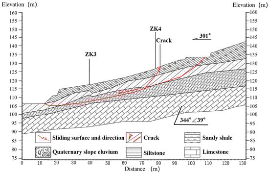 In order to analyze comprehensively the landslide and investigate the geological characteristics of the landslide strata, a total of six boreholes were deployed at the landslide site (Figure 4). Based on the findings from drilling and geological investigations, it can be determined that the landslide cover material is mainly composed of fine-grained clay and gravelly soil. The underlying bedrock consists of Carboniferous lower Malanbian Formation, which is composed of siltstone, sandy shale, and limestone (Table 1 and Table 2). Borehole data reveal that the sliding surface is situated within the sandy shale stratum. Physical tests indicate that the local geological strata are relatively fragmented, with poor physico-mechanical properties.