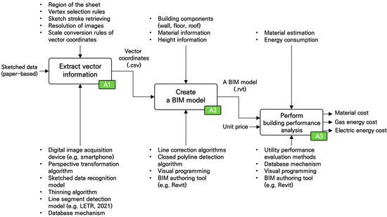 Figure 1 illustrates the process model developed through the IDEF0 modeling technique. The process model is composed of three stages: (1) Extracting vector information (Activity 1, A1); (2) Creating a BIM model (Activity 2, A2); (3) Performing building performance analysis (Activity 3, A3).