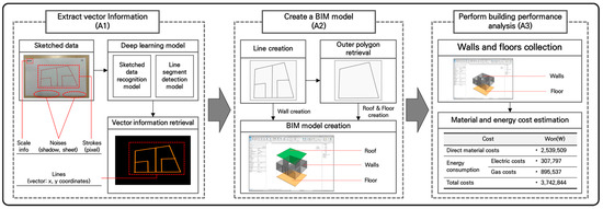In this research, we delineated two distinct phases to develop a framework aimed at the automated generation of BIM models from sketch information, incorporating building performance analysis such as cost estimation and energy consumption evaluation: (1) development of a process model, (2) implementation of the framework, and (3) validation of the framework. The development of the process model involved identifying and defining the specific steps required for framework development, as well as articulating and defining the relationships between data inputs, processing, and outputs. To develop the process model, we identified the flow of data and established a series of steps comprising activities. In the framework implementation phase, the activities defined in the process model were realized through system and user interfaces. The implementation of the system interface involved coding the algorithms defined in the process model and defining methods for data exchange between disparate activities. The user interface was developed to enable users to interact with the system interface and operate the system effectively. The validation verifies whether the framework can automatically translate sketch information into a BIM model consisting of walls, floors, and roofs, as well as conduct building performance analysis.