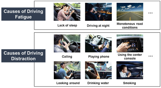 The phenomenon of driver fatigue and distraction has become one of the most concerning issues in the field of traffic safety [17,18]. Fatigue driving usually stems from long hours of driving or lack of sleep, leading to physical and mental exhaustion, slow reactions, decreased judgment, and problems such as inattention, increased reaction time, judgment errors, and confusion [19,20]. On the other hand, distracted driving occurs during the driving process when the driver’s attention is diverted from the task of driving due to external distractions or internal thoughts. Activities such as using a mobile phone, conversing with passengers, or adjusting the stereo can diminish a driver’s alertness to the traffic environment and reduce their ability to respond to sudden situations, thereby increasing the risk of traffic accidents [21,22]. Figure 1 illustrates the main causes and behavior patterns leading to driver fatigue and distraction.