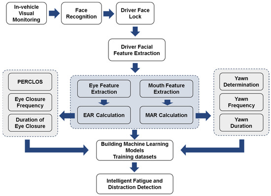 The basic workflow of intelligent detection methods based on facial features is as follows, as illustrated in Figure 3. First, the Eye Aspect Ratio (EAR) and the Mouth Aspect Ratio (MAR) are calculated. Then, based on the EAR value, eye fatigue assessment indicators are computed, such as the percentage of eyelid closure over the pupil over time (PERCLOS) [32], blink frequency, and the duration of continuous eye closure. Based on the MAR value, yawning can be determined by calculating the yawn frequency and duration. Finally, by integrating these assessment indicators into a model, a comprehensive judgment is made on whether the driver is in a state of fatigue or distraction.