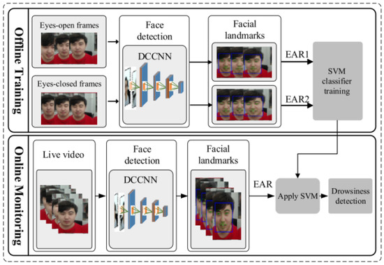 To address the shortcomings of traditional methods that do not consider individual differences among drivers, some studies have optimized detection approaches. Li et al. [36] improved detection effectiveness by constructing a driver identity information database and extracting facial features as a reference for assessing the driver’s state. This personalized method has obvious advantages, but its application range may be limited by the size of the offline library. You et al. [37] used a Deep Cascaded Convolutional Neural Network (DCCNN) to detect facial features and established an SVM model based on facial features, replacing traditional uniform threshold methods and adding personalized elements to fatigue and distraction detection. Although this increases the personalization of detection, the model’s general applicability and accuracy still need further verification, as shown in Figure 5. Han et al. [38] used the ShuffleNet V2K16 neural network for driver facial recognition, reducing the impact of the detection environment, and by comparing the current frame’s EAR and MAR values with the maximum EAR value and minimum MAR value of the previous 100 frames, they minimized the impact of individual differences, greatly improving experimental accuracy.