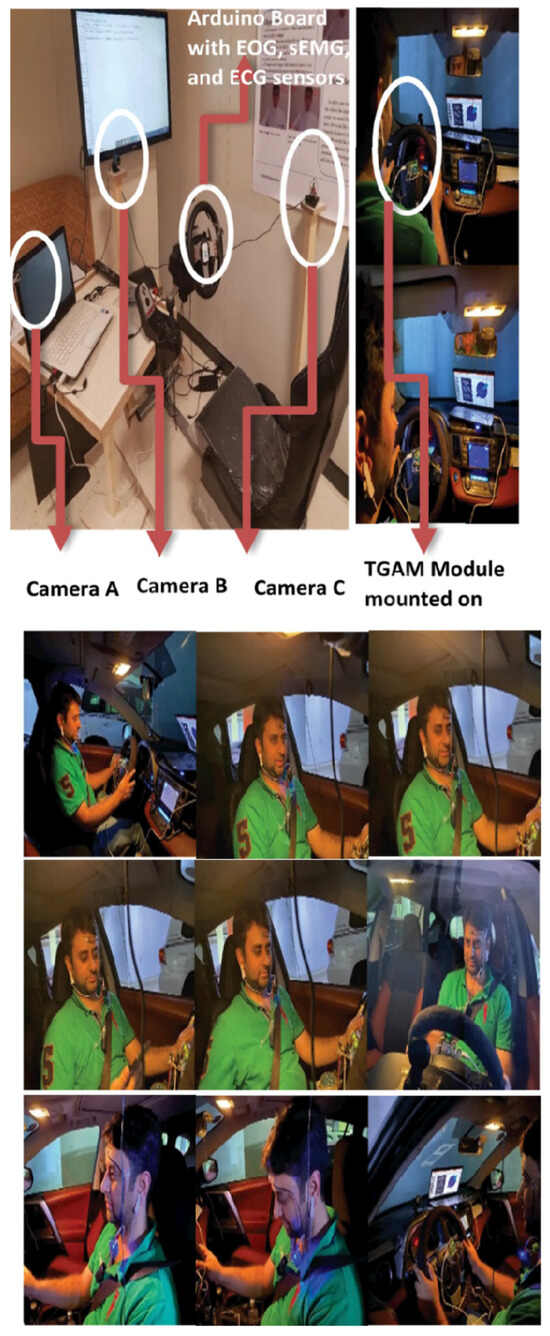 Wang et al. [63] integrated physiological signals collected by biometric instruments, such as heart rate and brain waves, with facial features and head postures extracted by cameras and trained with an RBF neural network, to achieve deployment and application at a lower cost. Du and others [64] addressed the issue of distracted driving caused by drivers conversing with others, by introducing the analysis and detection of voice signals. They proposed a dataset comprising three modalities: driver facial features, voice recognition, and vehicle signals, applied to the training of a multi-layer fusion model, achieving better detection results than single-modality models. Abbas and others [65] developed a multimodal detection system that integrates physiological and facial features for training a Deep Residual Neural Network (DRNN) model. They classified the driver states into five categories: normal, fatigued, visually distracted, cognitively distracted, and drowsy. The hardware setup is shown in Figure 6.