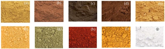 The investigated Raw Sienna (a), Burnt Sienna (b), Raw Umber (c), Burnt Umber (d), Yellow ochre (e), French Ochre (f), Green Earth from Verona (g), Terra Pozzuoli (h), Titanium Orange (i), and Titanium White (j) pigments.