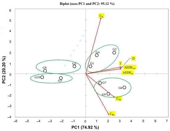 Moreover, via analysis of the biplot, we can identify four areas that group the considered samples: the first one composed of G1, G2, and G4; the second one of G3 and G8; the third one of G5 and G10; and the last one of G6, G7, and G9. The different behavior evidenced by the PCA algorithm can be strictly dependent on the chemical composition and mineralogical nature of the investigated pigments [,,,,].