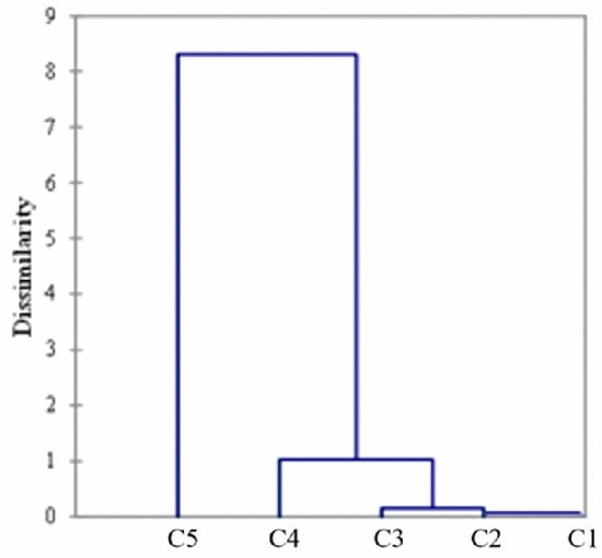 From HCA, samples were grouped into five clusters (C1, C2, C3, C4, and C5) (see Figure 4), in very good agreement with the results provided by PCA, from which four clearly distinguishable areas are provided.