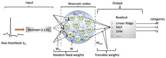Three layers constitute conventional RC models, Figure 3. The input layer receives observed data at time step n, with being the feature number of each heartbeat. Before being broadcast to the reservoir nodes, the data undergoes a reshaping process and then is projected onto the input weights .