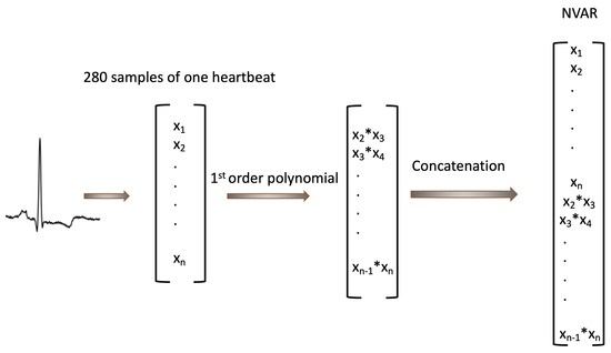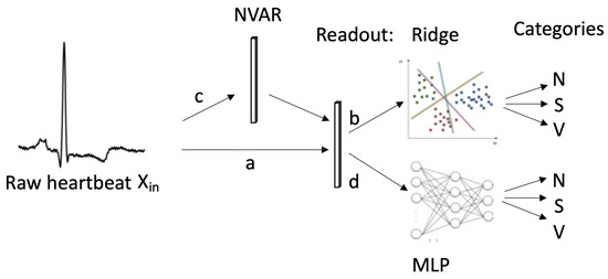 Next-generation reservoir computing (NG-RC) [48], which is based on nonlinear vector auto-regressive (NVAR) transformation, has shown promising results for forecasting complex dynamic systems. Extensive research has been conducted on reservoir computing (RC) [49,50], providing detailed explanations of the remarkable success of RCs and leading to the development of NG-RC. However, there has been insufficient research focused on the utilization of NG-RCs for arrhythmia classification.