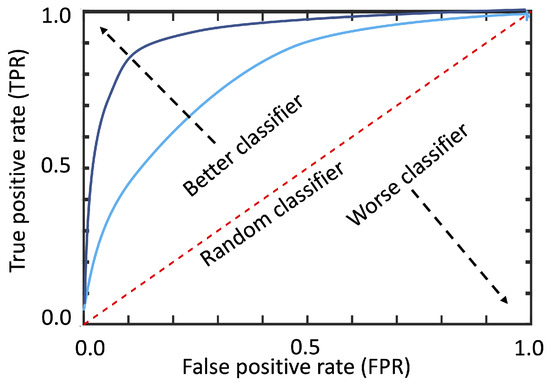 AUC is calculated by integrating the area under the receiver operating characteristic (ROC) curve over all possible thresholds. The ROC curve plots the true positive rate (TPR) against the false positive rate (FPR) at different thresholds, Figure 7. More information about AUC and ROC can be found in [55,65]. The convergence towards the upper-left quadrant signifies high performance characterized by both high sensitivity and specificity.