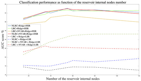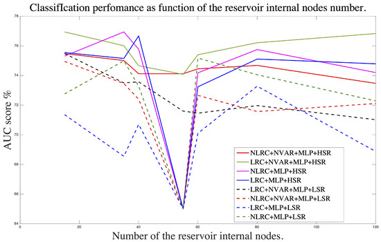 Classification performance as a function of the reservoir internal node number in the case of MLP readout. Experiments were performed to select the optimal number of the reservoir’s internal nodes.