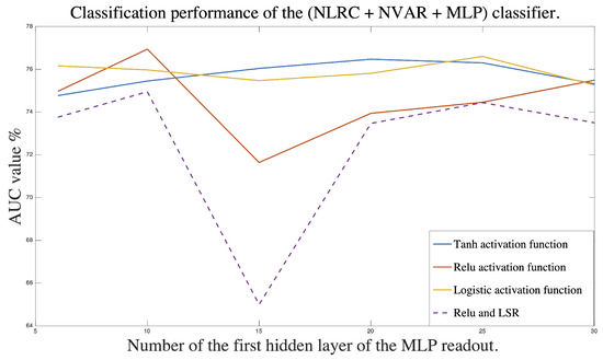 Classification performance as a function of the first hidden layer neuron’s number. Experiments were performed to select the optimal number of the first hidden layer of MLP readout evaluated on three activation functions: Tanh, ReLU, and Logistic.