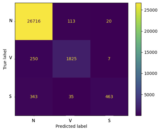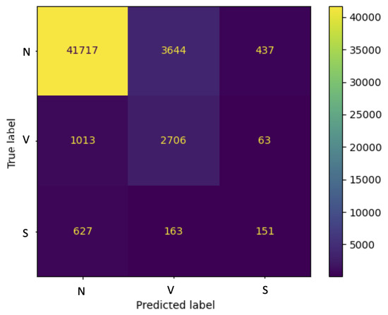 Typically, inter-patient outcomes are less accurate than intra-patient outcomes. Therefore, the classification results presented in Table 6, which are obtained with the current algorithm, are promising. The high ACC of 96.06% is noteworthy, especially when compared to algorithms trained with balanced data (marked with an asterisk (*)), which is not the case for the proposed classifier. However, this classifier performed poorly in identifying the S category, with low levels of SPEC, SEN, and PPV pointing to its failure. The difficulty of correctly identifying the S category for the inter-patient classification task is due to its complex nature and its high similarity to the N category (see Figure 2) that requires additional rhythmic information, like the R-R interval (i.e., the interval between successive beats) [69]. Additionally, classifiers based on RCs are still in the early stages of development, and further improvements are necessary to adapt them to inter-patient classification in general.