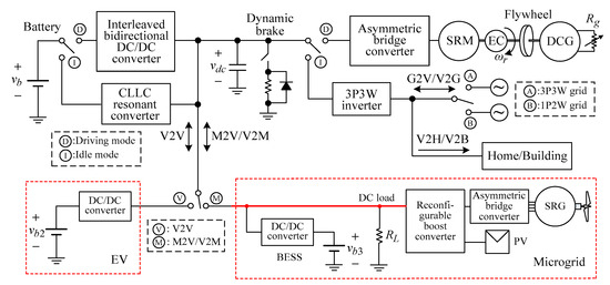 There also exist some possible interconnected operations regarding EVs. Vehicle-to-vehicle (V2V) [52,53,54] is one example application. It may be applied in roadside assistance for EVs. In [55,56,57], the V2V operations using the onboard charger schematic and motor windings are presented. When an EV has exhausted its battery-stored energy, it can be charged from another EV. The other possible interconnection is EV to microgrid, performing microgrid-to-vehicle (M2V) and vehicle-to-microgrid (V2M) operations [58,59,60]. The EV battery can be charged from the microgrid. Effectively utilizing the renewable energies to charge the EV battery can reduce the charging power needed from the grid and consumed fossil energy [61,62,63]. Conversely, as the energy deficiency in the microgrid occurs, the EV battery can provide energy support to the microgrid. The interconnection between the microgrid and EVs can express their complementarities. Regarding the popularization of G2V charging and V2G discharging operations between EVs and the utility grid, many reliability, safety, functionality, interference, and harmonic impacts to the grid are explored in [64,65,66].