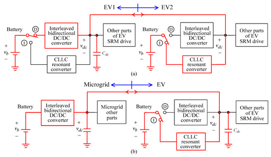 Interconnected operations of developed EV SRM drive to vehicle and microgrid: (a) V2V; (b) M2V/V2M.