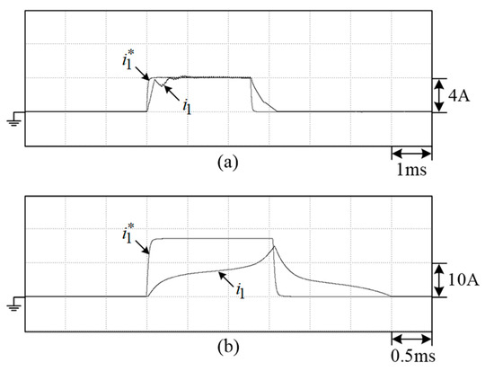 The control scheme shown in Figure 11b consists of an outer voltage loop and an inner current loop. The current command of each cell ( and ) is generated by the voltage controller . And the PWM control signal of the two cells ( and ) is yielded by the current controller . The two PWM control signals are compared with two sawtooth waves ( and ) phase-shifted by to generate the switching signals.
