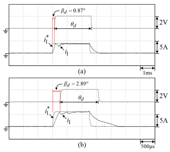 As shown in Figure 5, the DCT scheme is proposed to shift the commutation angle forward automatically, which excites the stator winding at the small inductance slope region (). By neglecting the winding resistance and back-EMF, and assuming the constant winding inductance (), the advanced shifted time interval and angle can be estimated to let the winding current be raised to the command as follows: