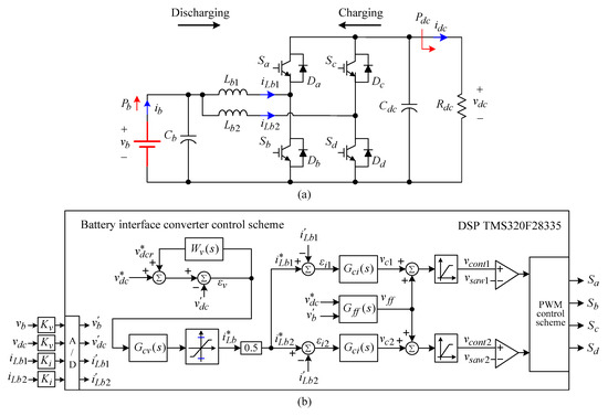 Figure 11a,b show the schematic and control scheme of the established interleaved boost/buck converter with two cells. The switching signals between the two cells are phase-shifted by . The interface DC/DC converter can be operated in the following modes: