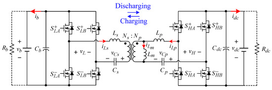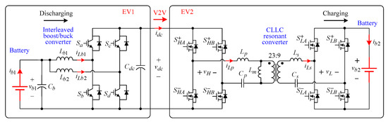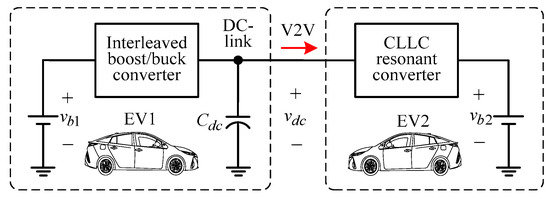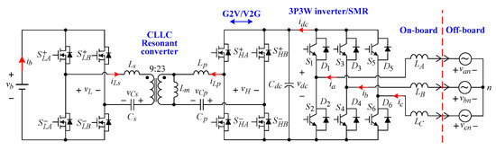 For an EV, it is necessary to make the grid-to-vehicle (G2V) charging operation [25,26,27,28,29,30] through the onboard charger when the EV is in idle mode. The charger can be formed using integrated schematics [25,30], or can be added externally. Generally, battery charging can be classified between level 1 and level 3 [31,32,33]. The related standards can be found in [32,33]. Limited by size and weight, the EV onboard charger usually performs level 1 and level 2 charging levels. In order to conduct G2V operation, the EV charger usually includes an AC/DC switch mode rectifier (SMR) to possess the power factor correction (PFC) function, and a DC/DC converter is equipped to control the charging voltage and current. The survey for some existing SMRs is referred to in [34,35,36]. And some control researches for SMRs are presented in [37,38,39]. Furthermore, galvanic isolation is required for safety reasons. Despite a low frequency transformer for galvanic isolation being very simple to use, it is too bulky and heavy to equip on the vehicle. To solve this problem, one can employ the dual active bridge (DAB) converter using a high-frequency (HF) transformer [40,41]. Moreover, the CLLC resonant converters [42,43] can be applied to have higher efficiencies.