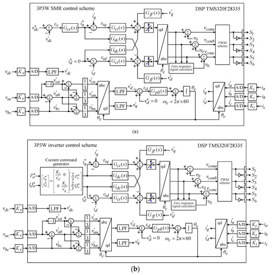 In driving mode, the SRM drive varied DC-link voltage is established by the battery via an interleaved bidirectional boost/buck converter. The improved motor driving performance over a wide speed range with reduced battery energy consumption can be achieved. In idle mode, the grid-connected G2V/V2G operations are conducted through the bidirectional CLLC resonant converter and the bidirectional 3P3SW inverter. The bidirectional inverter is operated in inverter mode under V2G operation, and conversely as an SMR when conducting the G2V charging operation. With the same schematic, the vehicle-to-home and vehicle-to-building operations are directly applicable. The critical loads normally powered by the grid can be transferred to the EV, providing uninterruptible power as the grid power failure occurs. In addition, the V2V and/M2V/V2M operations can also be conductible. The functional blocks are shown in Figure 2a,b.