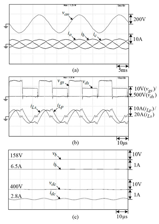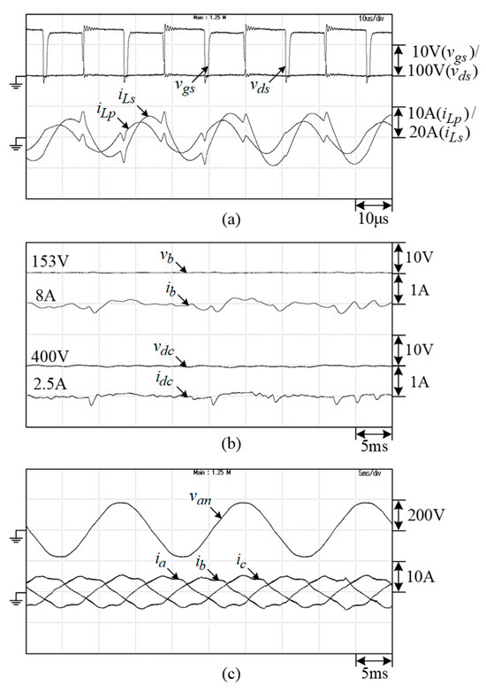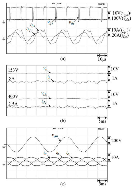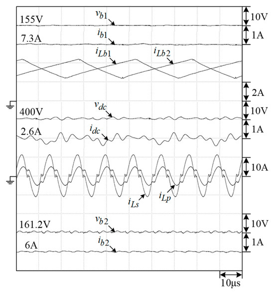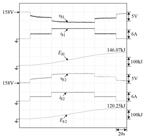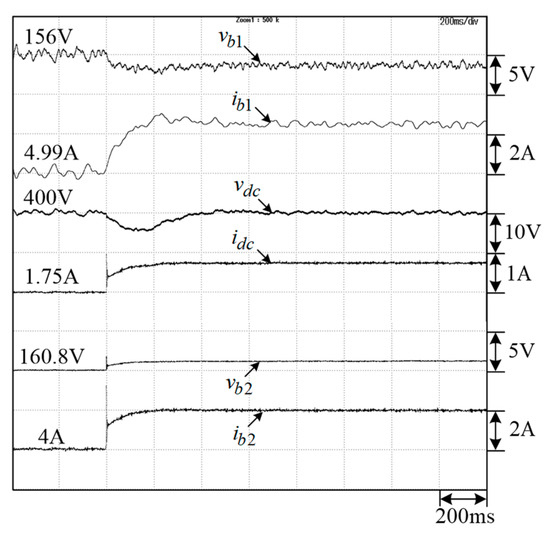 In the M2V operation, the microgrid DC-link voltage is established by the SRG and interleaved boost converter. The measured results of the M2V operation under battery charging power are shown in Figure 32. A successful charging operation can be seen in the results.