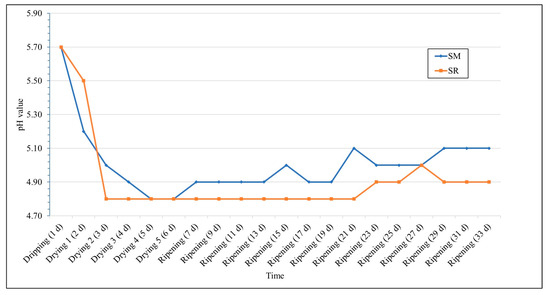 Acidity in dry-cured meat products is linked to the growth of lactic acid bacteria (LAB), commonly used to start the salami-making process [28]. The acidification of meat during the first days of the ripening process is crucial to guarantee the attainment of a suitable pH, ensuring the microbiological quality of salami [29]. The pH monitoring of salami during the ripening process is shown in Figure 1.