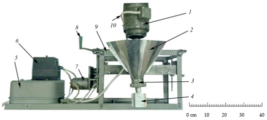 Photograph showing the laboratory 3D printer: 1—electric motor of the extruder; 2—hopper of building mixture; 3—auger; 4—replaceable nozzle; 5—control panel; 6—frequency converter of electricity; 7—reverse motor moving the extruder in the horizontal direction; 8—manual drive moving the extruder in the vertical direction; 9—frame; 10—power cable of electric motors.