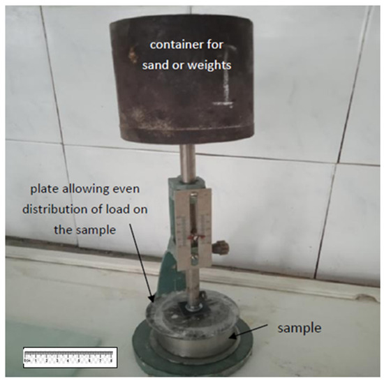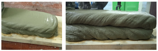 The main task in the study of concrete mixtures suitable for a 3D printer is to ensure their necessary shape during extrusion from the printer head with the achievement of the specified strength of the layers (structural strength), as well as the adhesive strength between the layers of extruded concrete without the formation of cracks and other defects [4,37]. To determine the structural strength, a method is proposed that allows measuring the ultimate load on a sample of an extruded layer of concrete, at which it begins to deform (Figure 3 and Figure 4).
