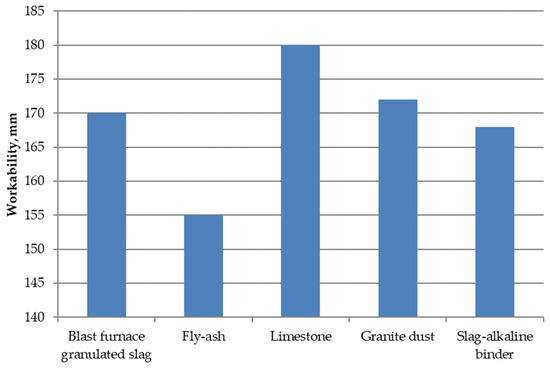 The analysis of the obtained data (Figure 6) makes it possible to conclude that to ensure the formability of mixtures using different mineral additives, the workability of the cone on the shaking table is different. It is the smallest for a cement–ash composition, which is explained by the spherical shape of the fly ash part, which provides the necessary extrudability with the lowest water consumption of the concrete mixture [20,39].