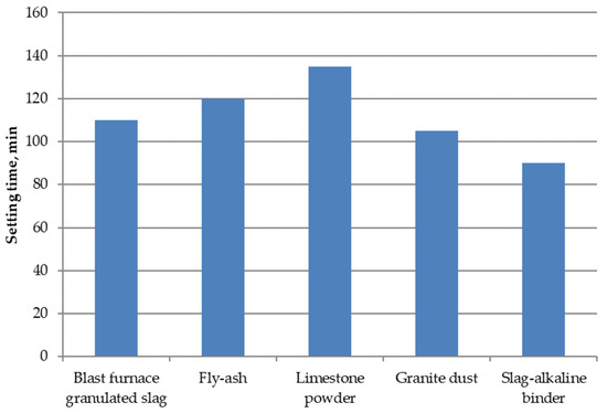 - The initial setting time or “printing window” is most significant when using limestone. The smallest initial setting time observed for the slag–alkaline binder.