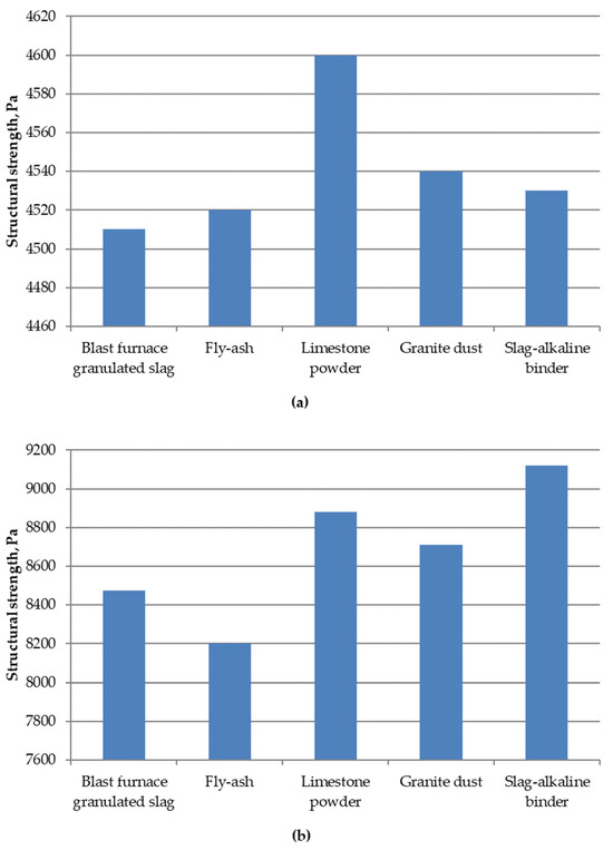 The structural strength of the mixtures for 3D printer (Figure 8) after 20 and 40 min of mixing is the highest when using limestone and slag–alkaline binder, respectively, which is consistent with the beginning of hardening of these mixtures. The most minor structural strength achieved is with fly ash, which can be explained by its spherical parts, which cause the sample to spread under the action of the load from the upper layers.