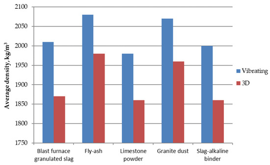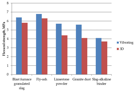 According to Figure 9, a significant decrease in the average density, up to 140 kg/m3, is observed in the samples obtained with the help of a 3D printer based on slag, slag–alkaline binder, and limestone, which can be explained by the increased water consumption of the mixtures. The lower density of 3D-printed materials compared to samples of vibrated materials is a direct consequence of the compaction of the material during vibration and better packing of sand grains. The direct consequence is a higher density of vibrated materials. Material densification results in higher strength parameters (see Table 6). The decrease in density when using granite dust and fly ash is smaller and achieved at 110 kg/m3 and 100 kg/m3, respectively.