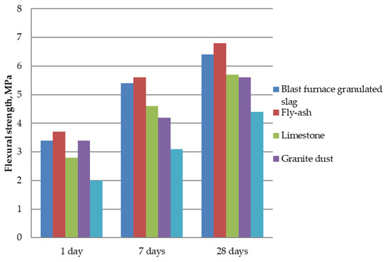 The highest values of bending strength (Figure 10) were obtained when using fly ash and blast furnace granulated slag, and the lowest with slag–alkaline binder, which can be explained by the amount and pozzolanic activity of mineral additives. A similar picture is observed for the effect of compression (Figure 11), splitting (Figure 12) and bending strength (Figure 13).