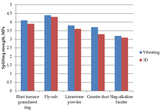 - The highest values of bending, splitting, and compressive strength were obtained when using fly ash and blast furnace granulated slag, and the lowest for the slag–alkaline binder.