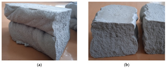 The nature of the destruction of the samples based on the slag–alkaline (Figure 14a) and the cement–ash binders (Figure 14b), after determining the bending strength, show that in the absence of defects, the destruction of the samples during splitting can occur both on the boundary of the layers (Figure 15a) and on another area (Figure 15b), with high uniformity and adhesive strength between the layers.