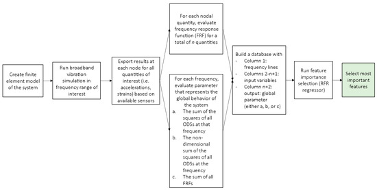 After all local and global quantities are evaluated, the database can be created according to Table 1. The first column contains the frequency, columns 2 to (n + 1) contain the FRF at each desired location and represent the input variable, and the last column (n + 2) contains the global parameter and will be the output quantity for the random forest regressor. The random forest method can be run to obtain the ranking of the most important features, which can then be selected as the location and type of sensor needed for modal testing.