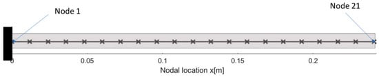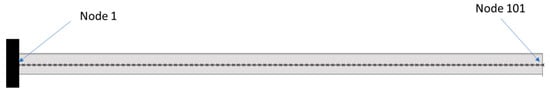 The transverse behavior of the beam is modeled using 1D Euler–Bernoulli beam elements. The beam is clamped on one side, corresponding to Node 1; a transverse time-varying load is applied at the free end of the beam, corresponding to Node n of the beam (Figure 3). The mesh of the beam is shown in Figure 4.