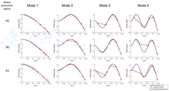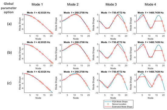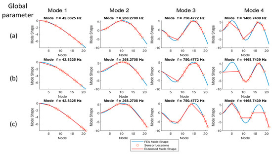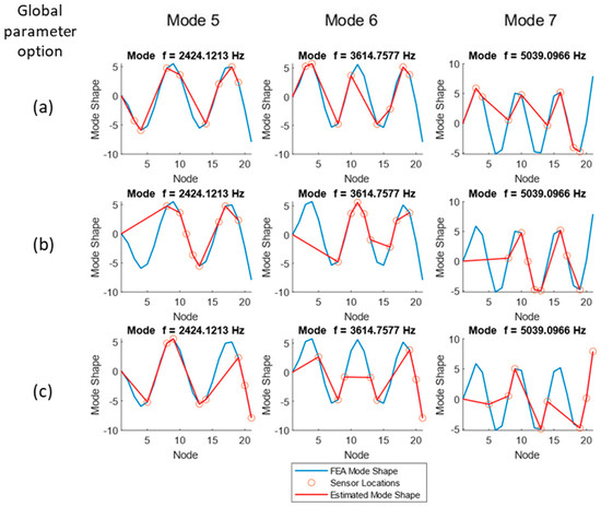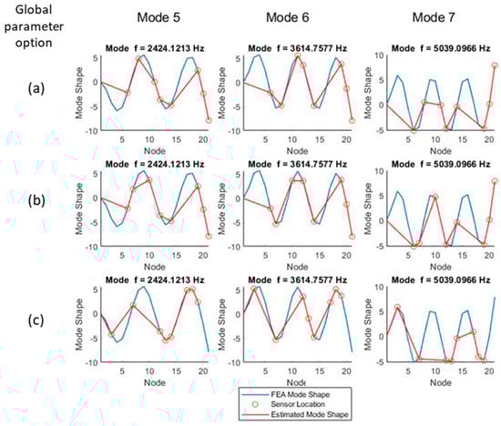 All global parameter options appear to track the first two mode shapes adequately; however, the normalized ODS- (global parameter b) and FRF-based (global parameter c) methodologies miss more peaks than the ODS (global parameter a) method, especially at higher frequencies. Both the normalized ODS- and FRF-based methods exhibit peak clipping starting at mode 4 and place sensors at inflection points; therefore, they will not be able to capture those frequencies.