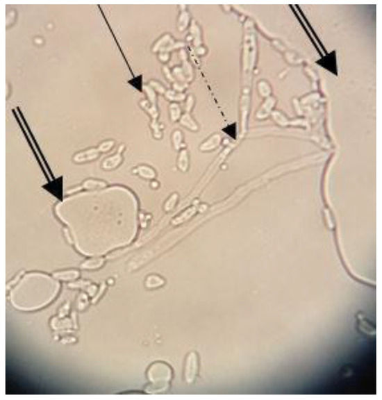 Y. lipolytica CMGB32 cell interactions with n-hexadecane droplets after three days of incubation (40×) (plain arrow—yeast cells; dashed arrow—pseudohyphae; double arrow—n-hexadecane droplets).