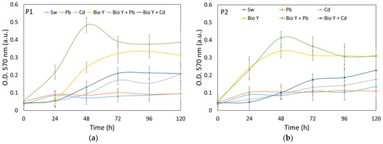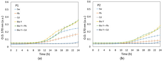 The growth curve of the yeast strains (Rhodotorula mucilaginosa CMGB-G1 and R. mucilaginosa CMGB 188—previously isolated from oil polluted environments and included in the CMGB collection of microbial strains) was determined in synthetic wastewater contaminated and uncontaminated with Pb2+ and Cd2+ ions, both in the presence or absence of a biosurfactant. This was achieved using 96-well plates containing 400 µL of sample inoculated with 1% of each yeast strain with an initial concentration of 2 McFarland (for Sw, Pb and Cd with P1, and P2, respectively) supplemented with 5% (v/v) biosurfactant (for Bio Y, BioY + Pb, Bio Y + Cd). The experiments were conducted for 24 h at a temperature of 28 ± 1 °C (i.e., controlled conditions), and optical density values were recorded hour by hour at 570 nm using a Synergy HTX Multimode reader (BioTEK, Winooski, VT, USA). Optical density (OD) measurements were also used to determine the degree of yeast development during the 120 h of the experiment (i.e., experimental conditions).
