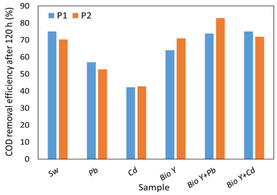 The results obtained in this study (Figure 4) show a significant reduction in COD by up to 86% compared to the reference (508 ± 9.6 mg O2/L) value. It is important to emphasize that the synthetic wastewater samples containing a biosurfactant showed COD values comparable to or even higher than the synthetic wastewater without Pb2+ and Cd2+ ions. In the presence of metal ions, without biosurfactants, COD reduction ranged from 42% for Cd2+ to 57% for Pb2+. It is interesting to note that R. mucilaginosa CMGB 188 (P2) showed, on average, a higher COD reduction capacity than R. mucilaginosa CMGB-G1 (P1), considering all types of samples tested. Moreover, the results obtained in this study are comparable with a previous study [31] conducted by our group, where the efficiency of removing COD from synthetic wastewater was tested using five different yeast strains: Kluyveromyces marxianus CMGBP16, Saccharomyces cerevisiae S228C, Saccharomyces cerevisiae CM6B70, Saccharomyces cerevisiae CMGB234, and Pichia anomala CMGB88. The results showed a COD removal efficiency of up to 70%. In a different investigation, a reduction in COD ranging from 50% (Candida krusei) to 71.6% (Candida albicans) was observed when using a 1% (v/v) inoculum rate, but after 25 days of the experiment [70].